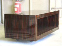 This high gloss, lacquered table is shown with macassar ebony veneer