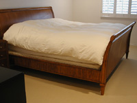 Bed is made with solid maple and maple veneers with a warm light brown stain. The intricate details in the head board, foot board and base define this beautiful piece