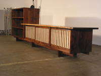 Credenza and accompanying bookcase are made of solid claro walnut.Features include dovetail joinery, live-edged walnut top, and rosewood butterfly inlays.